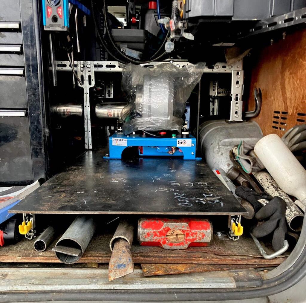 源建設様ではホース修理車での作業を容易にするために、加締機を載せるスライド可能で検尺等もできる作業台を自作されていました!