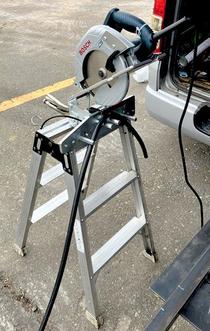また、ホースカッターに関しても作業時に高さを合わせるために、バイスプライヤーを使用して脚立に取付されています。