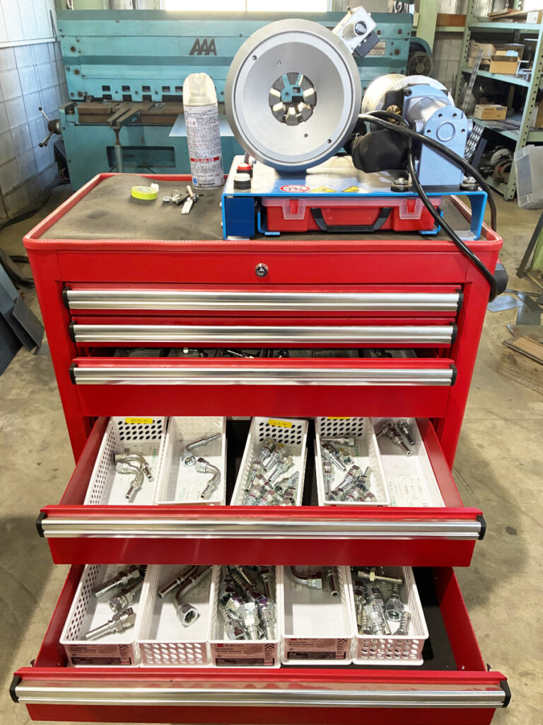 また、以前は油圧ホース製作のために他社へ持ち込む必要があり、往復の移動時間と費用が発生していましたが、その負担も解消されました。配管後に寸法が合わず、修正や追加処理を行うといった手戻りもなくなり、結果として時間とコストの両面で削減効果が生まれています。
