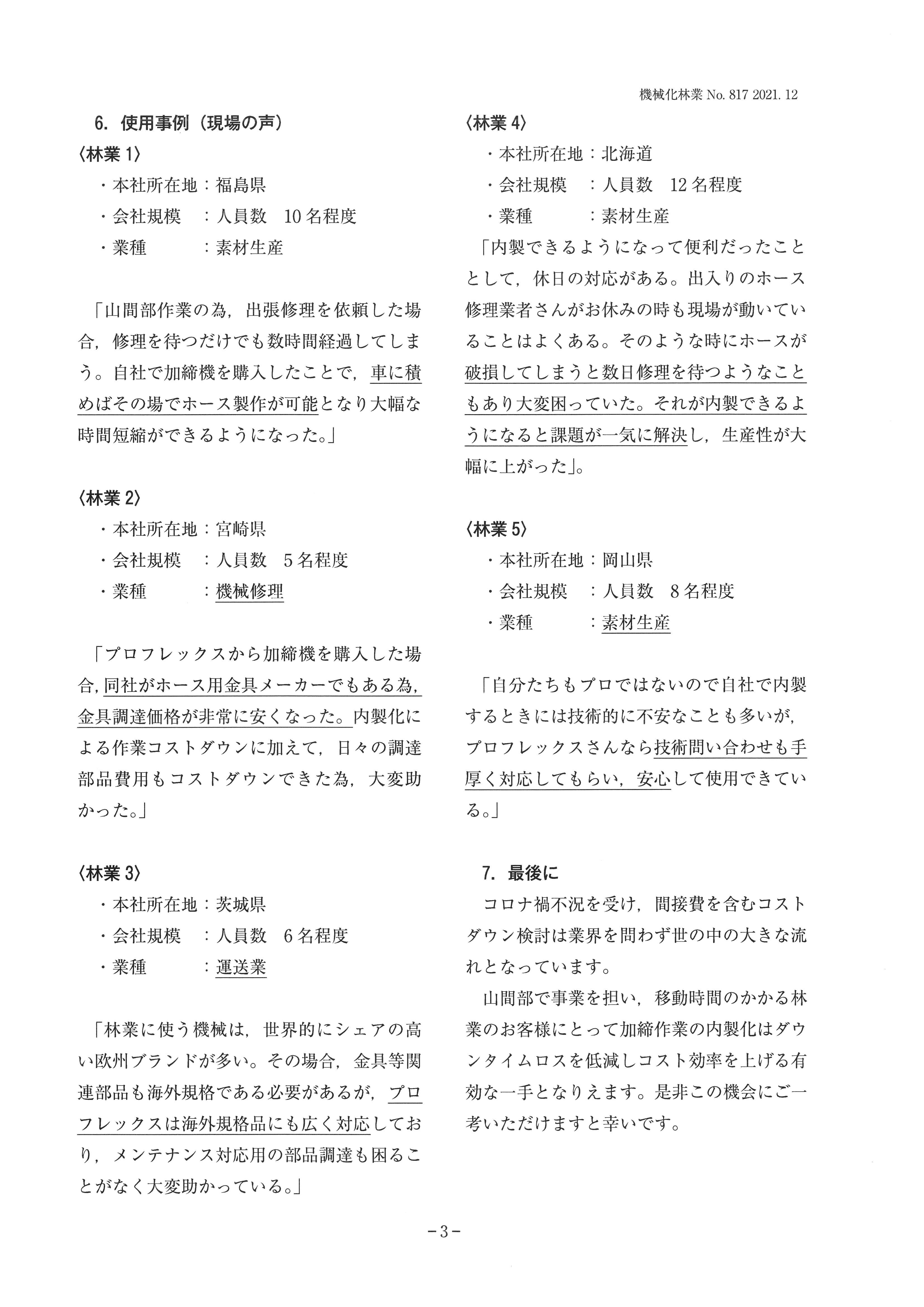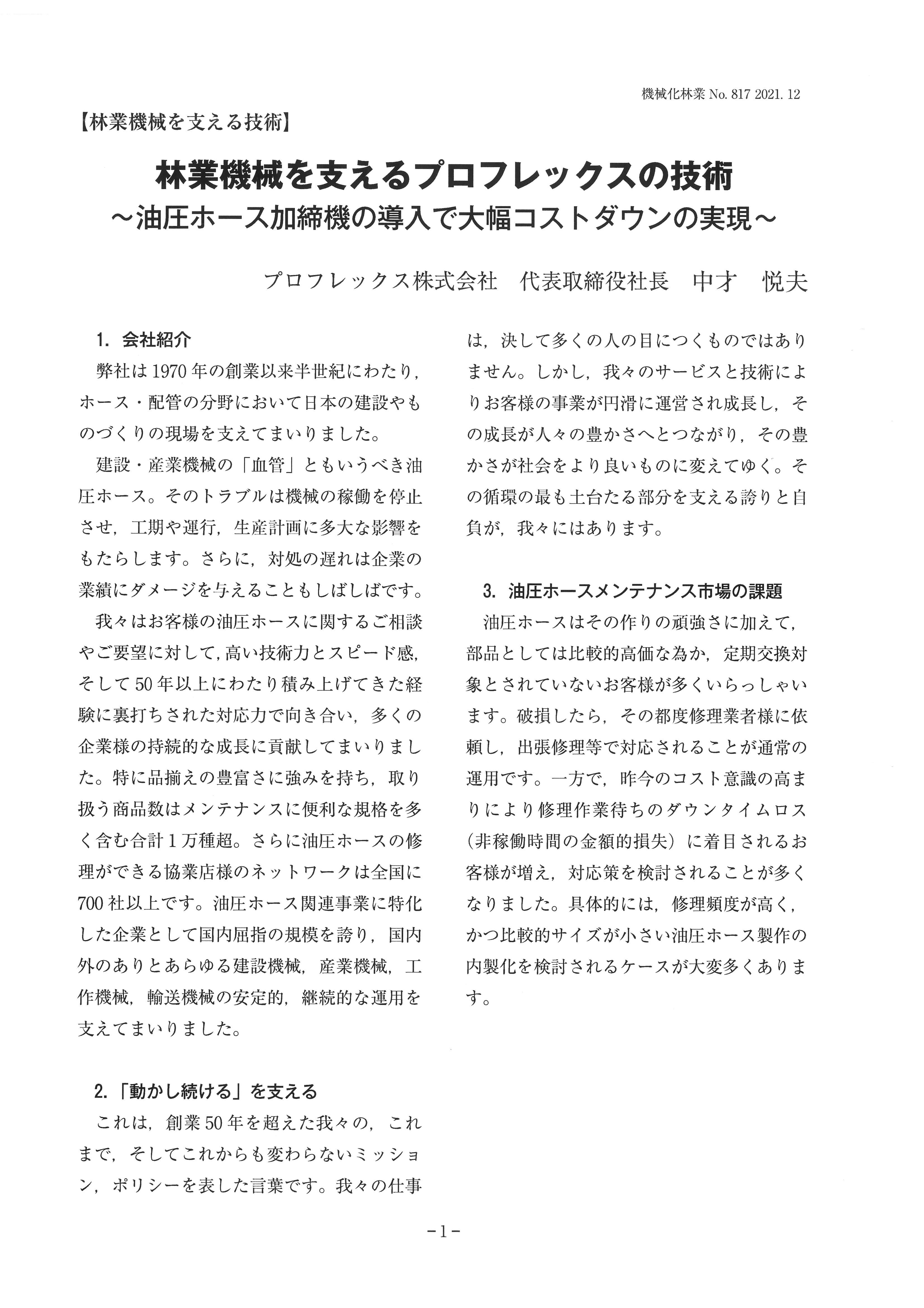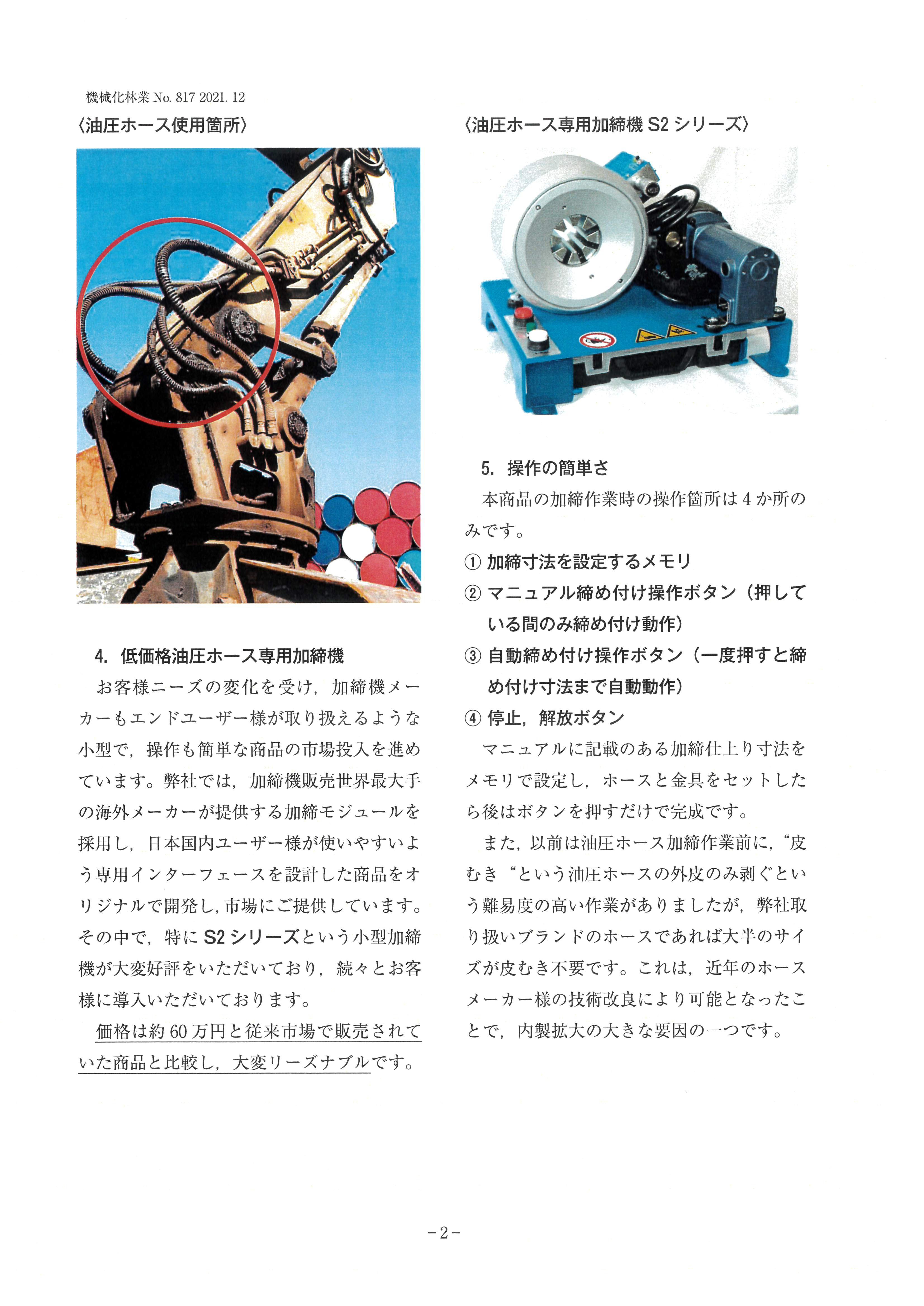 一般社団法人 林業機械化協会が発行する、月刊誌「機械化林業」12月号トップ記事に低価格油圧ホース専用加締機のご紹介・使用事例(現場の声)などが掲載されました。