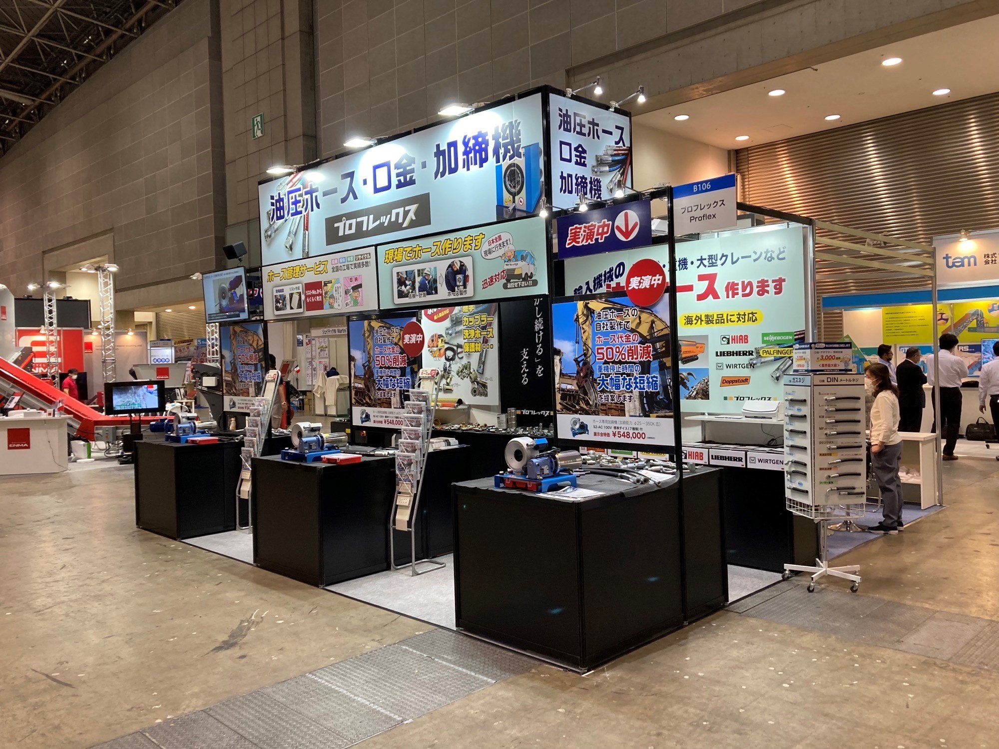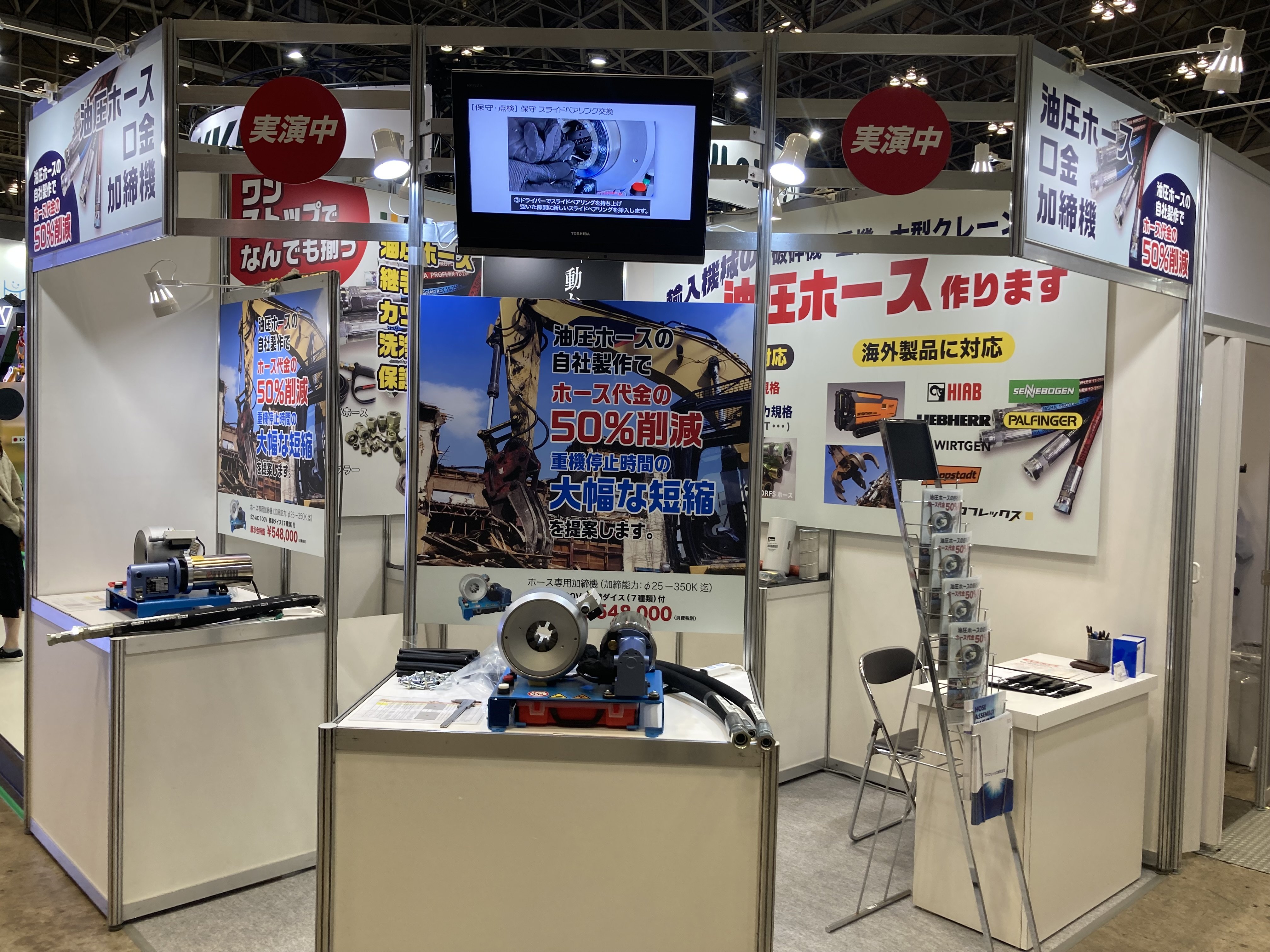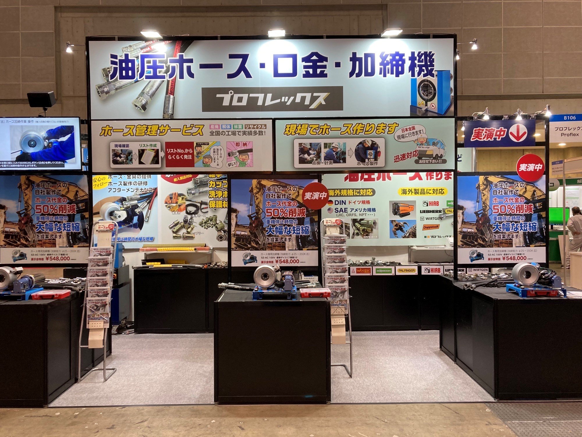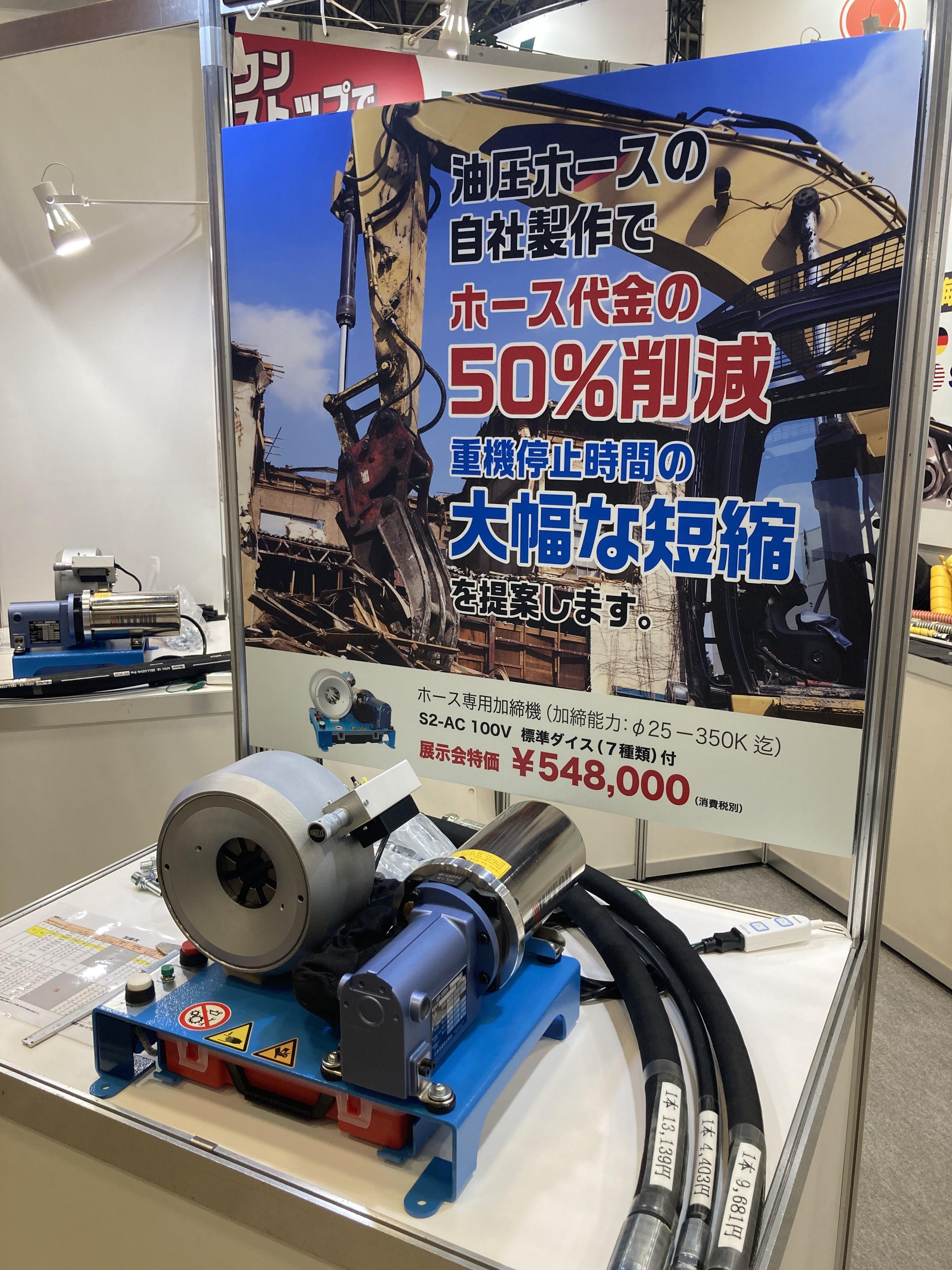 弊社はいずれの展示会でも、安価でコンパクトな加締機『S2-AC』を使用したホースの内製化による「ホース製作費用」と「ホース破損による機械のダウンタイム」を大幅に削減できるサービスを紹介いたします。