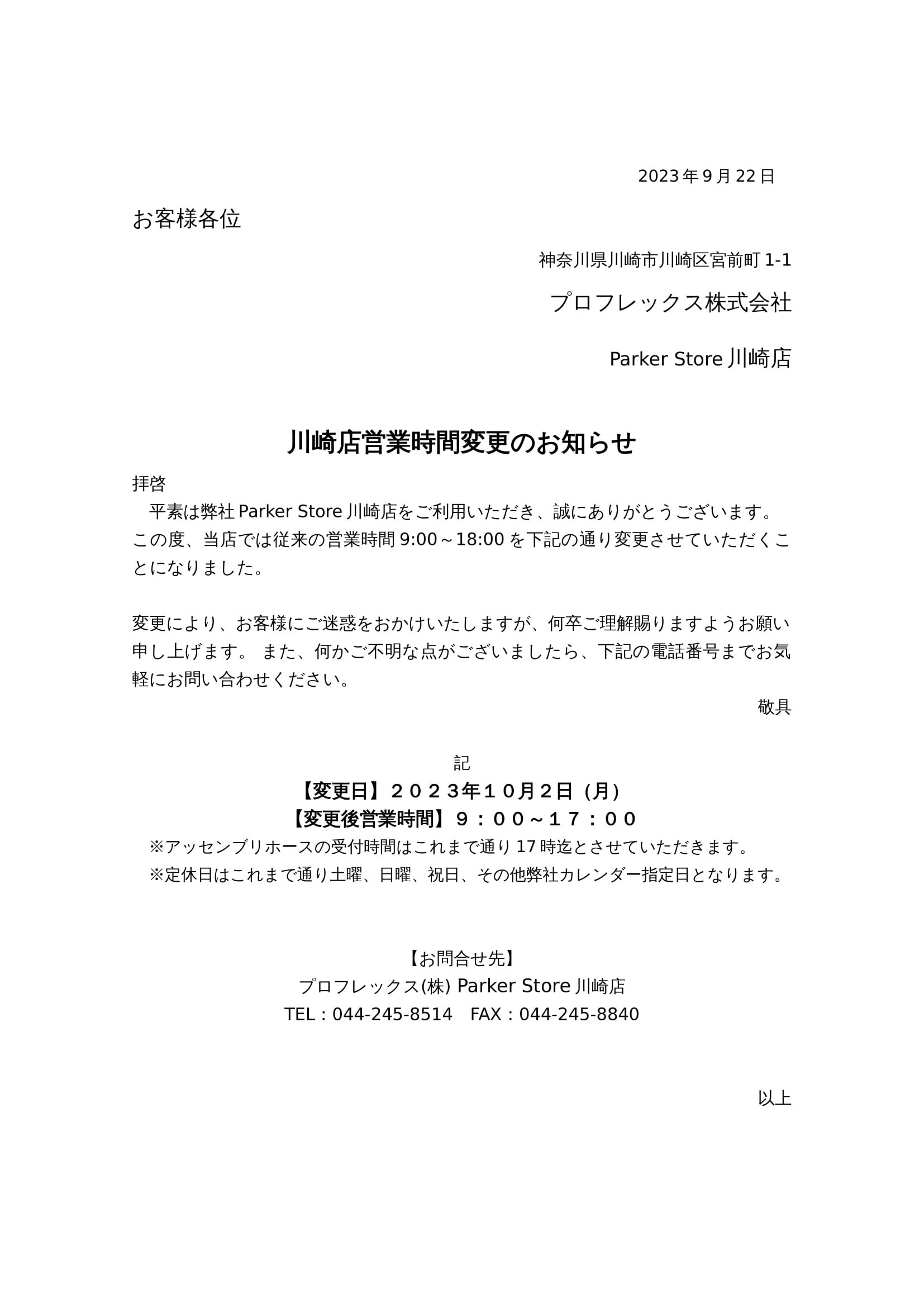川崎店営業時間変更のお知らせ