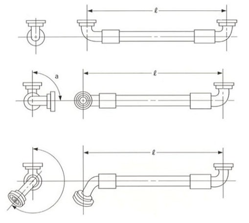 ホース長さは下図の(ℓ)を参考にご指示ください。またベンド金具の向きが異なる場合は、片端の口金を目より遠くに上向きに置き、手前側口金の角度を時計回りに計測してご指示ください。(下図(a)参照)