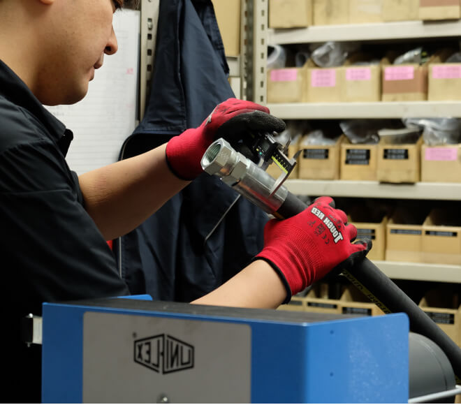 プロフレックスでは、プロのスタッフがホースや継手金具を確認し、仕様の判別・選定を行います。