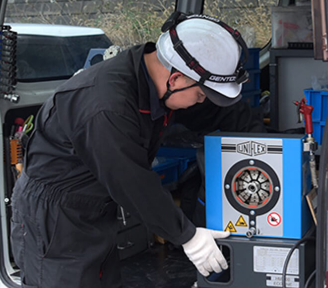 小型の加締機と配管部材を積み込み、電話一本で現場へ急行。